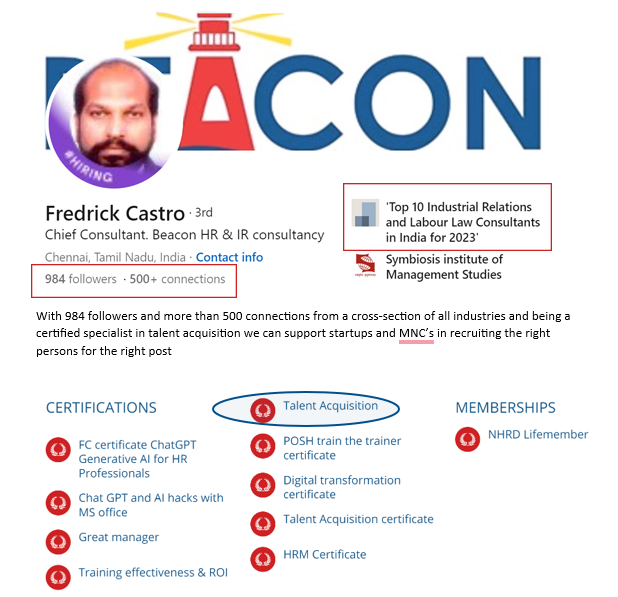 Bad hires are a nightmare. Rapid growth, sudden vacancies and other pressing demands can prompt employers to make rushed hiring decisions. Attracting the right candidates and hiring the right talent needs meticulous knowledge of the subject. With access to all important portals like Naukri, Shine, Indeed, CareerBuilder, Glassdoor, ZipRecruiter and 769 connections and still growing; 984 followers, on Linkedin and being a member of leading HR whatsapp groups and with his specialised certification in talent acquisition we can get the right candidates.